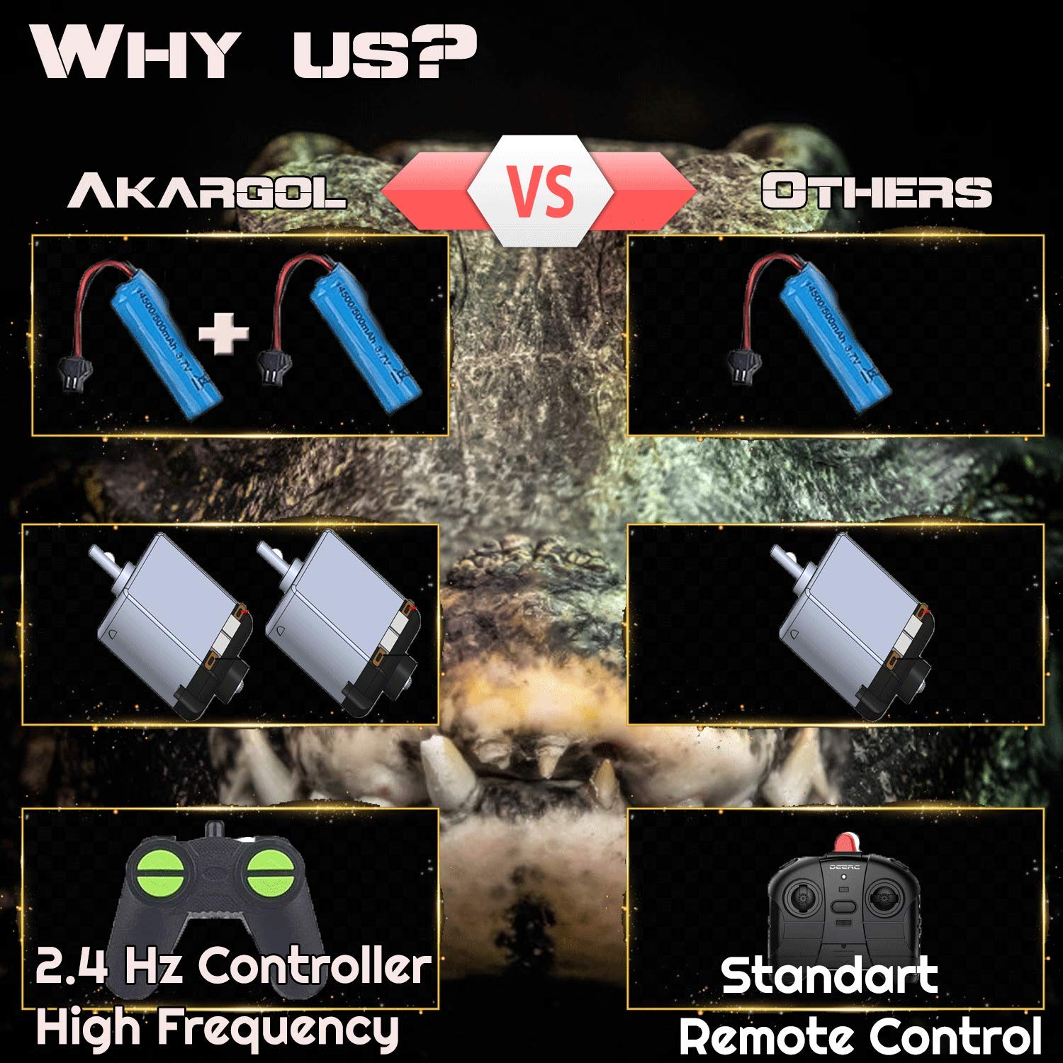 - HAVE 2.4 GHz REMOTE CONTROLLER: Akargol Alligator head RC boat for adults and kids fun the water. This high-quality crocodile boat equipped with a 4-channel 2.4 GHz remote controller with a 50-meter signal range in pool, pond and lakes.