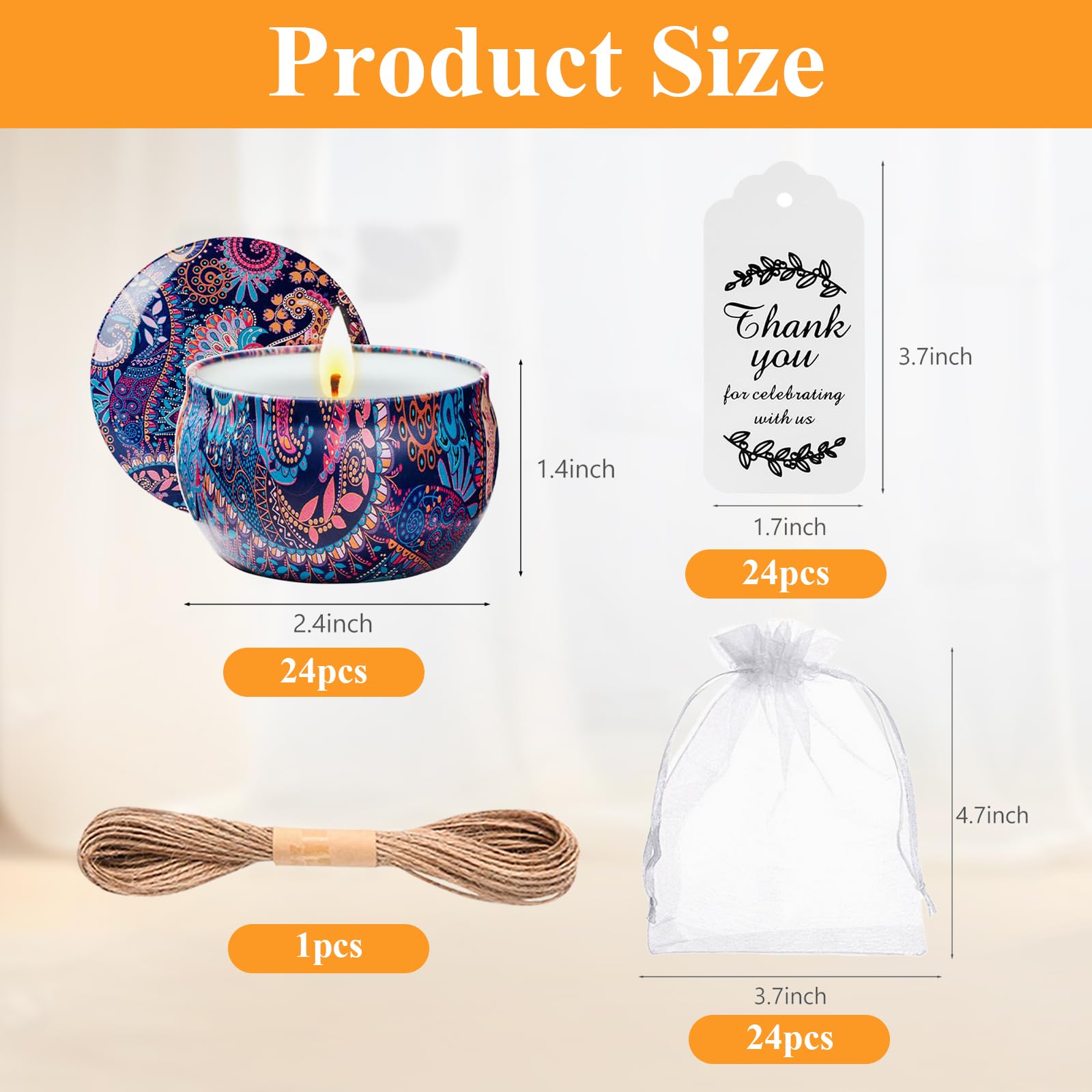 - Candle Sets for Women Gift: Our scented candles gift set includes 24 beautifully packaged candles, 24 charming thank-you tags, 24 classy white gift bags and a 18meter hemp rope. Perfect for adding a touch of elegance to any occasion, this set is ideal for baby showers, weddings, holidays, and special celebrations