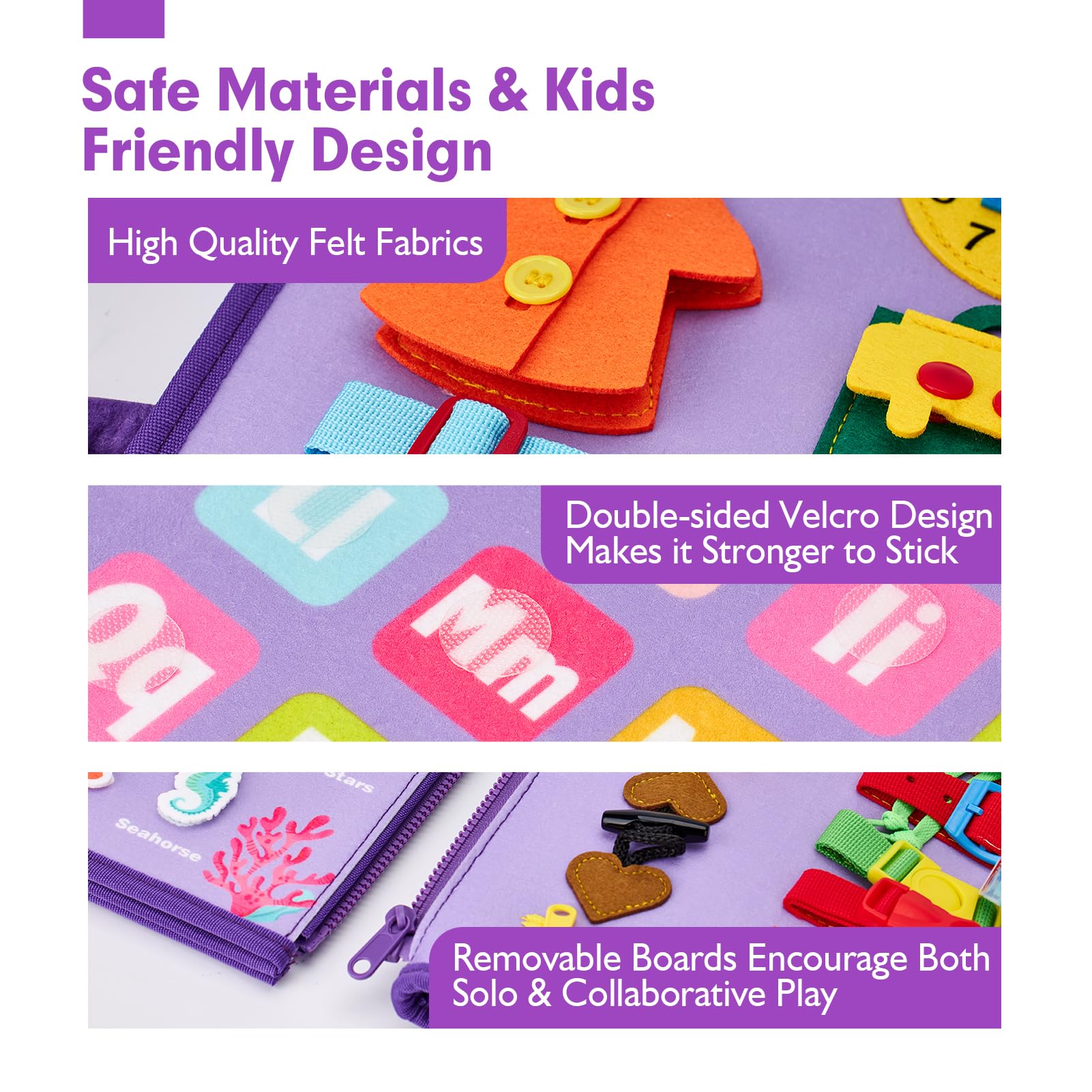 - High-Quality Material & Exquisite Packing: They are made of safe and excellent quality felt fabric, which is strong and durable enough to withstand the stress of normal play, the board and the fastenings on it are soft yet sturdy. It is packed in boxes, which make a perfect gifts for toddler girls.