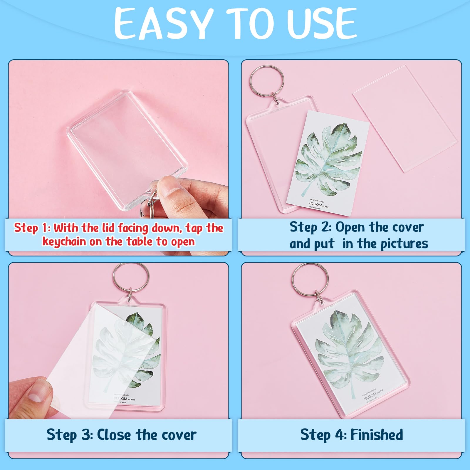 - Easy to use: you can just simply remove the clear casing panel, insert your photo and then clip the panel back into place, the blank photo keychain keyrings are clear on both sides, so you can insert 2 pictures at once time