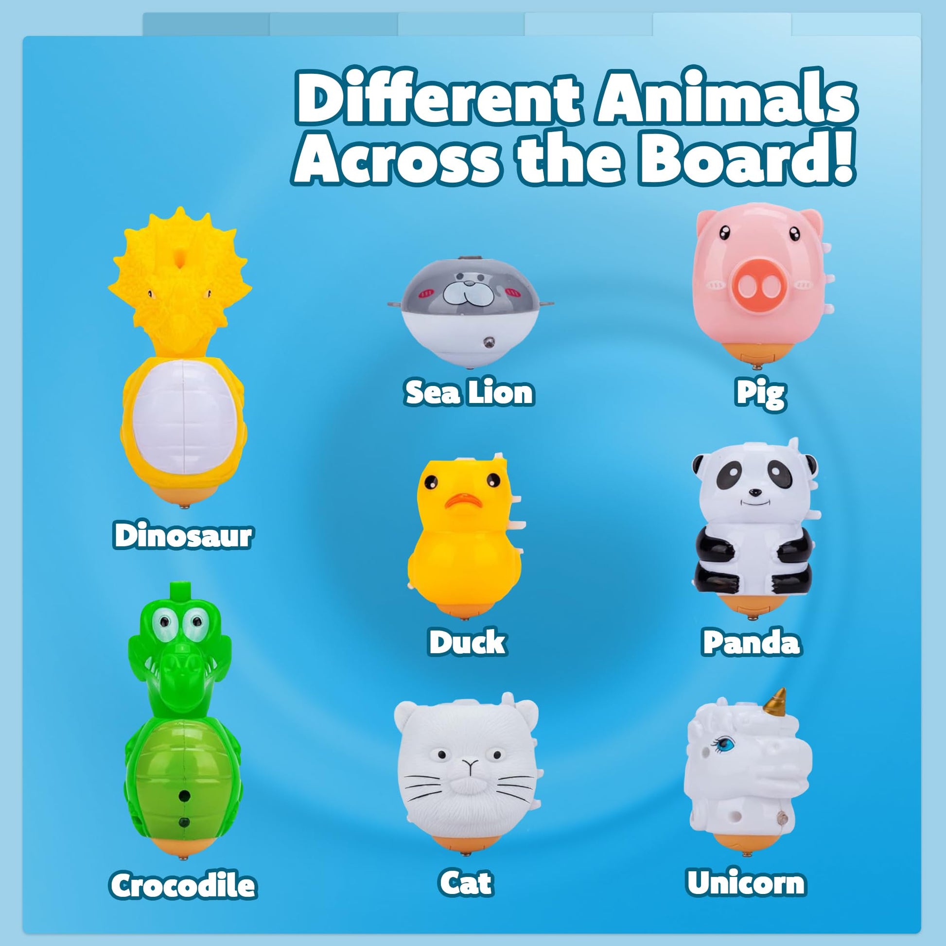 • SPINNING SAFARI FUN: This set of animal light up spinning tops for kids features 8 adorable characters like a unicorn, panda, and dino—all ready to light up and spin into action!