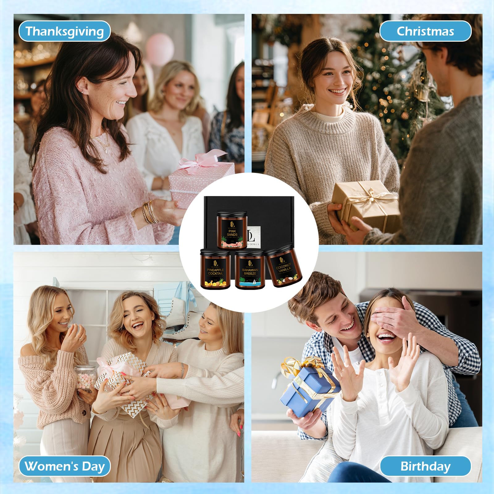 - Four Unique Scents: This 4 pack scented candle set includes four of the most popular scents: the romantic ocean scent of pink sands, the warm sweetness of coconut vanilla, the tropical vitality of pineapple cocktail, and the fresh holiday style of Bahamian breeze. Whether it is a relaxing, romantic or energetic moment, there is always one for you.