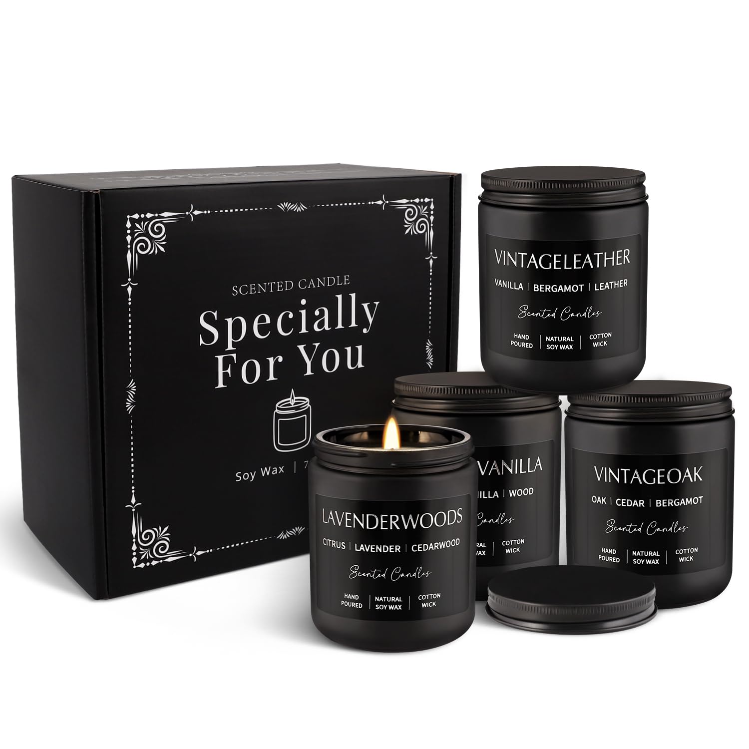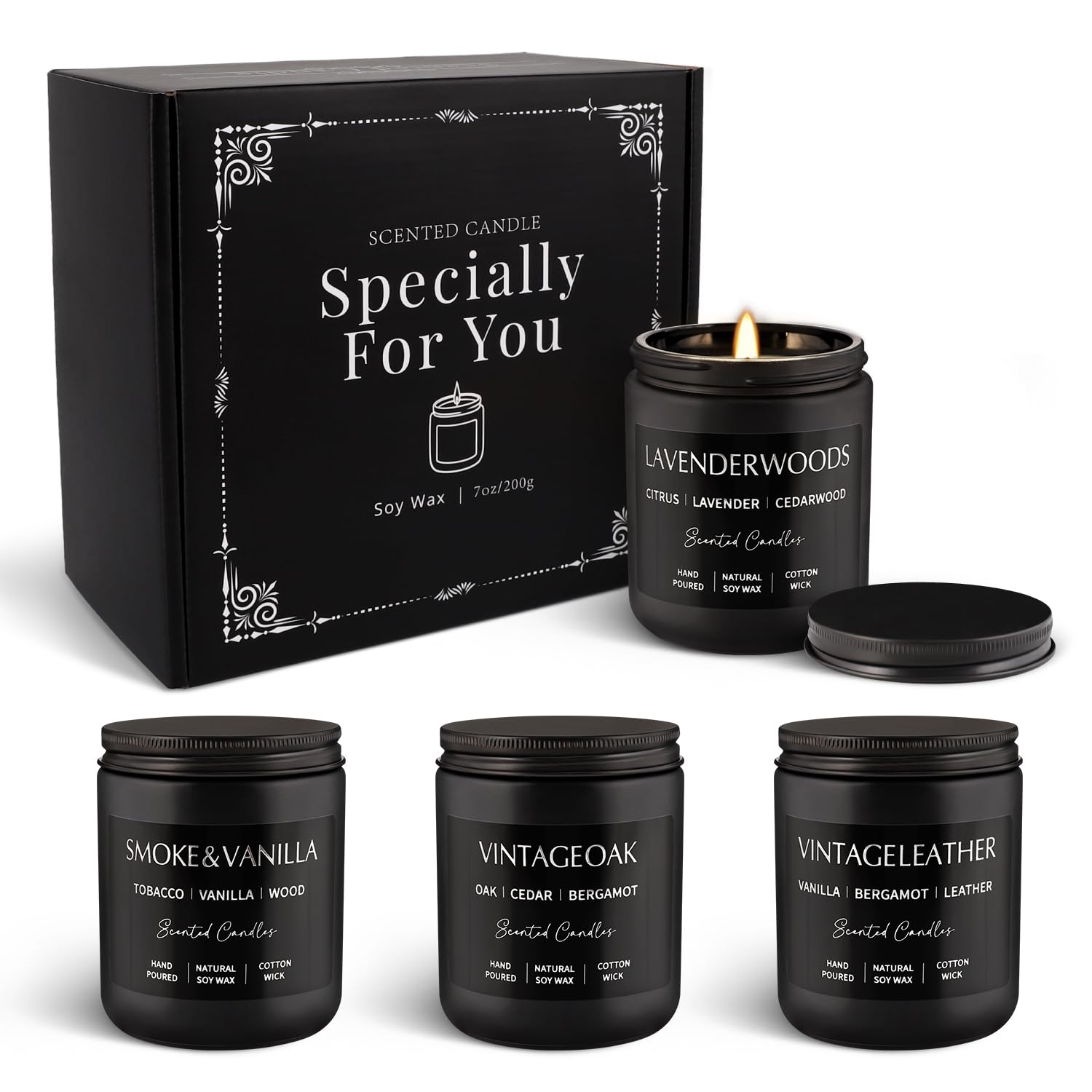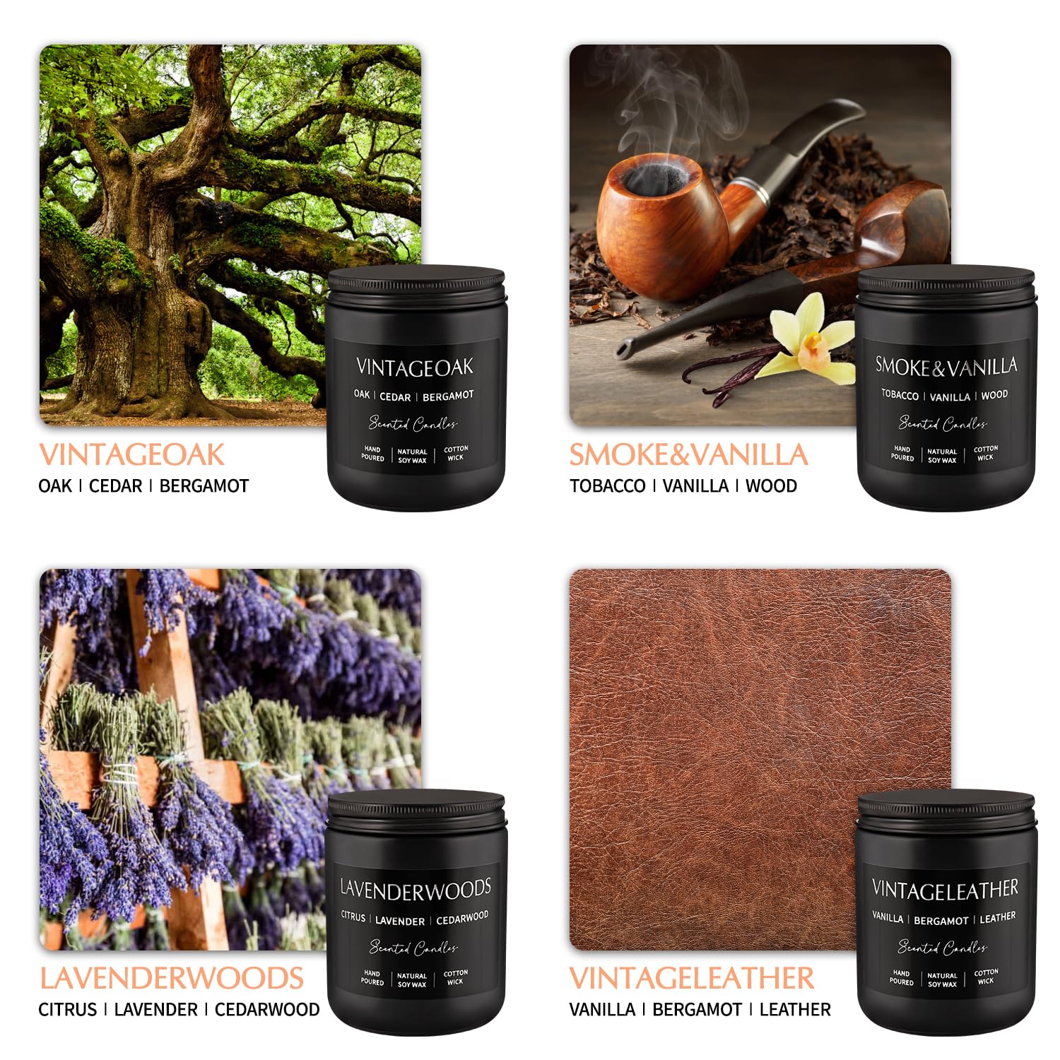 Scented Candles Gift Set - 4 Pack (7oz Each) Soy Wax Aromatherapy Candles with Essential Oils, Smokeless - Leather & Smoke, Vanilla Oakmoss, Lavender - Relaxing Fragrance for Home, Office, Yoga
