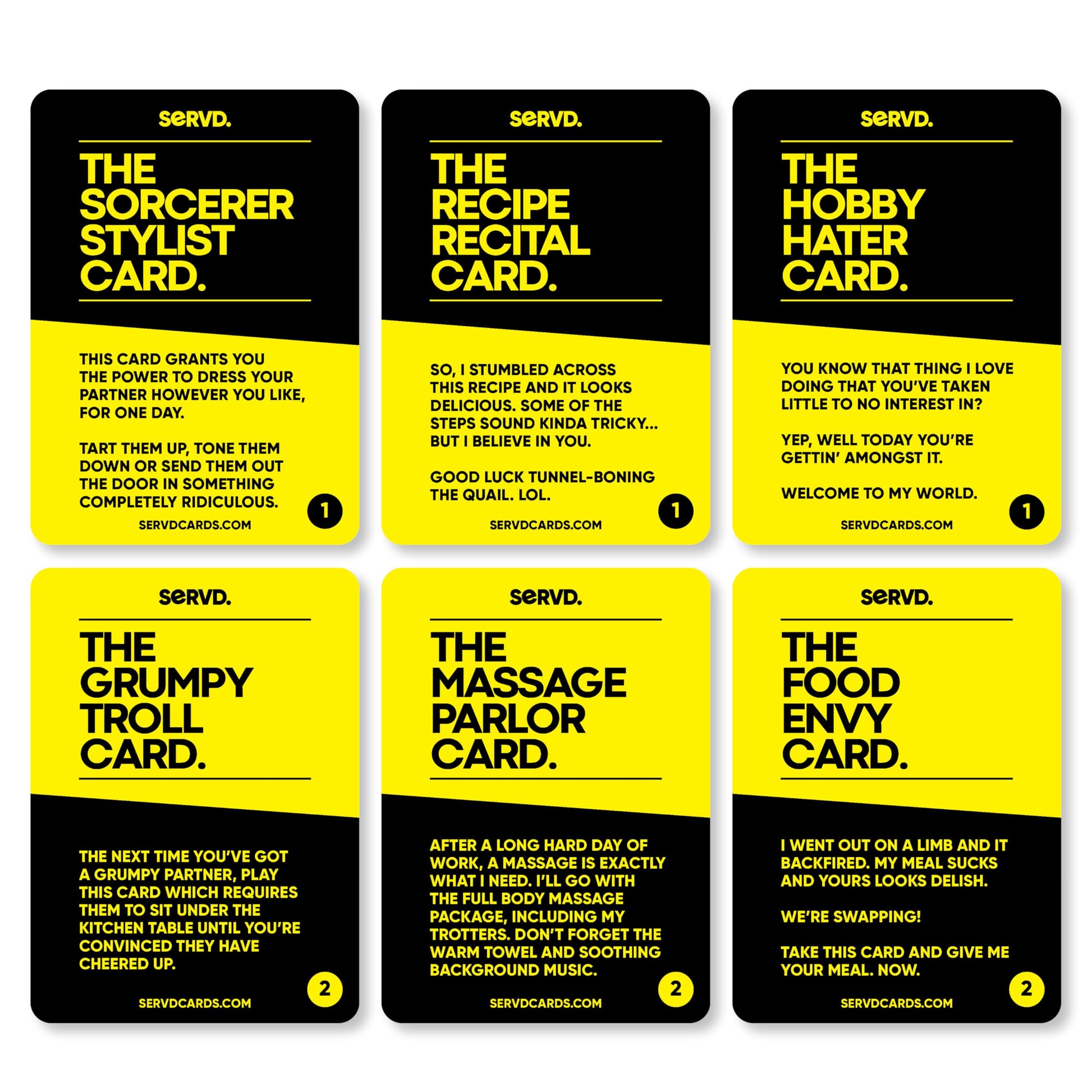 - WHAT’S IN THE SERVD DECK? 62 life-changing relationship-based cards, granting both players 31 chances to hilariously take down their partner. What could possibly go wrong?
